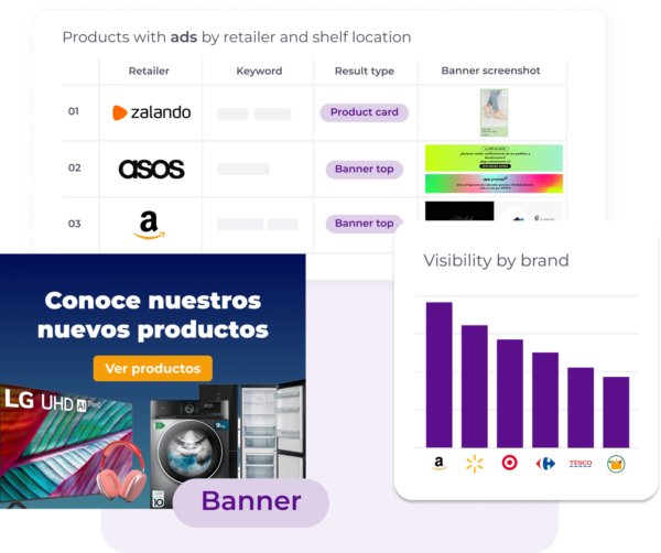 Your e-commerce teams will be able to monitor sponsored products, branded banners and video ads on marketplaces such as Amazon or Walmart, with SEM and PPC dynamics.